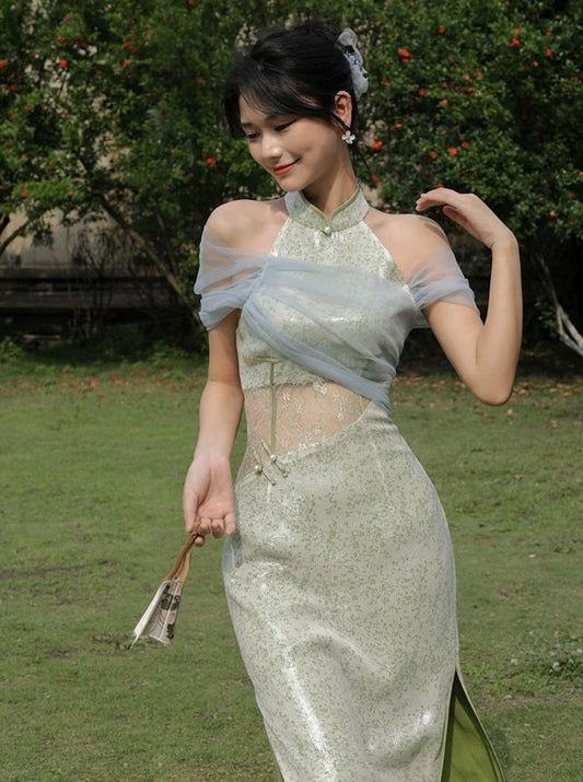 ノースリーブストリーマーグリーンスパンコールワンピース