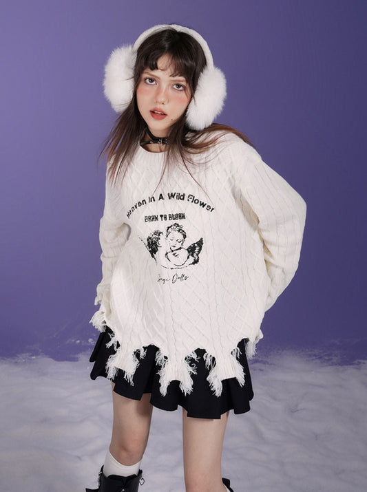 スウィートクールミルクホワイトエンジェルプリントダメージニット