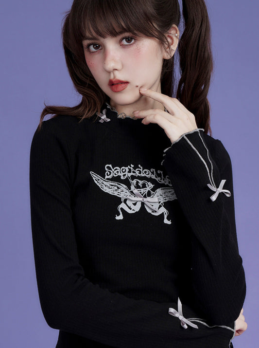 ダークスイートクールホットガールボウハーフタートルネックプリントセータートップス