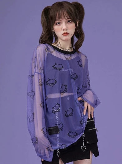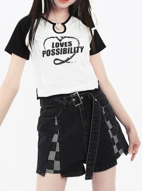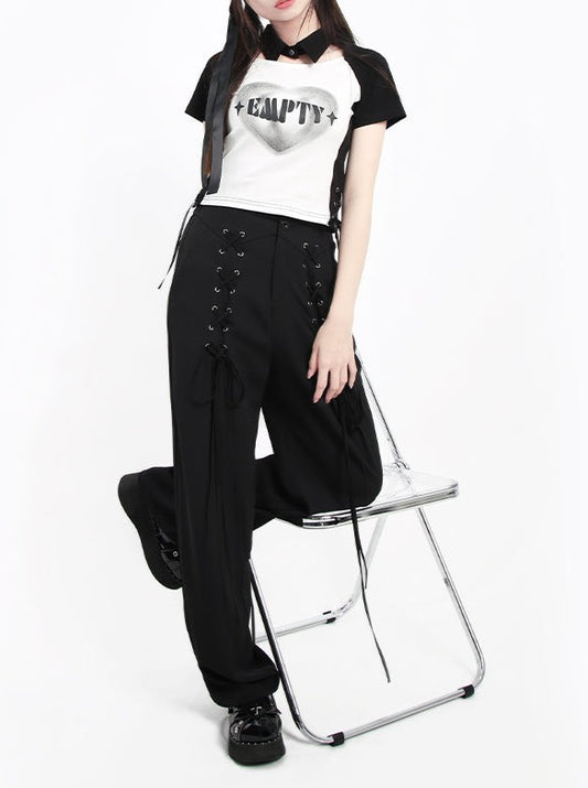 ブラックホワイトハートプリントスプリットポロカラートップ T シャツ