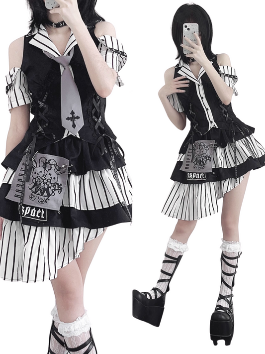 コードラビットオリジナルオフショルストライプシャツ+アシメストライプティアードスカート+クロスネクタイ