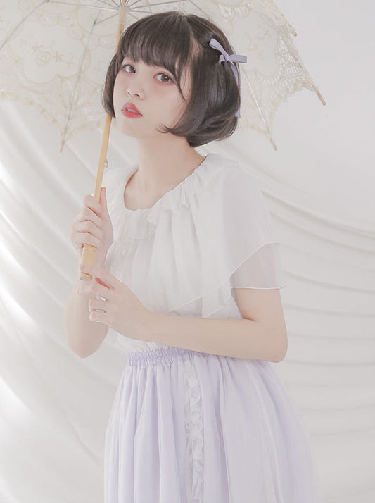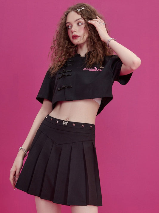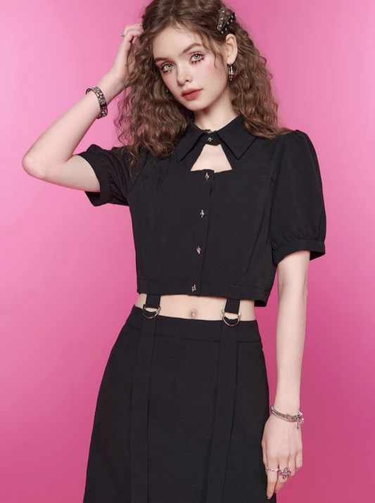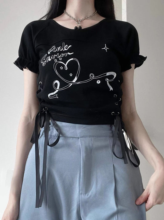 プリントリボンパフスリーブクロップドTシャツ+ブルードレープパンツ