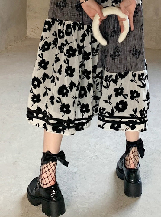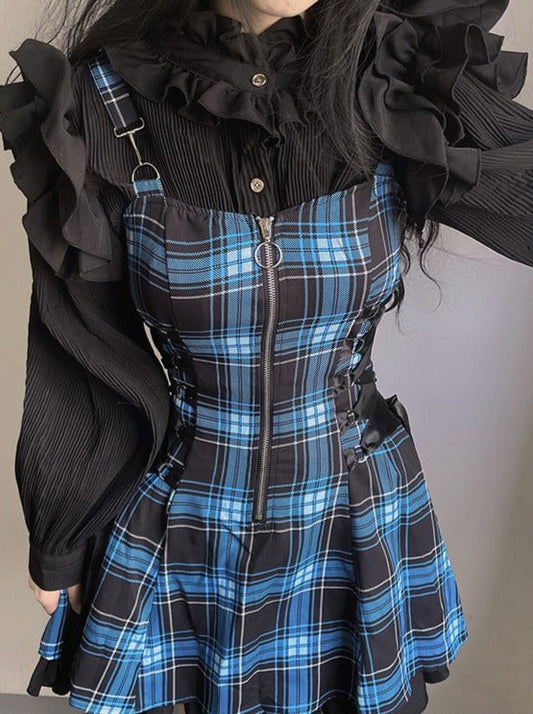 ボリュームフリルブラウス+レースジップアップチェックサススカート+ブラックフリルデザインスカート