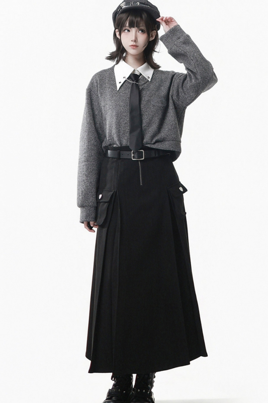 グレーウィンタープレッピーカレッジロングトップス+ショートトップス+スカート+パンツ+シャツ