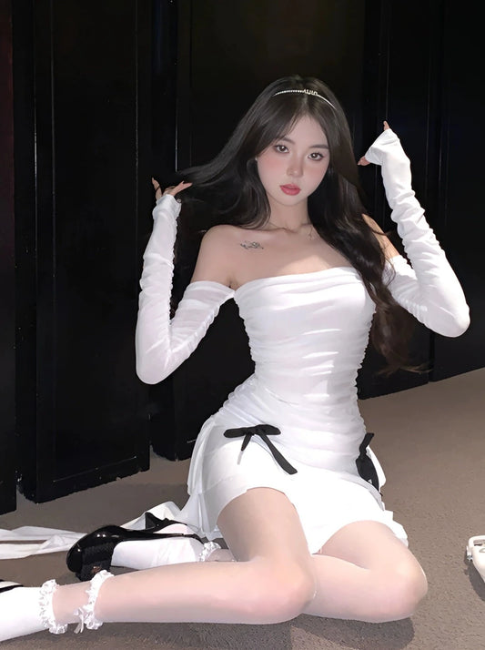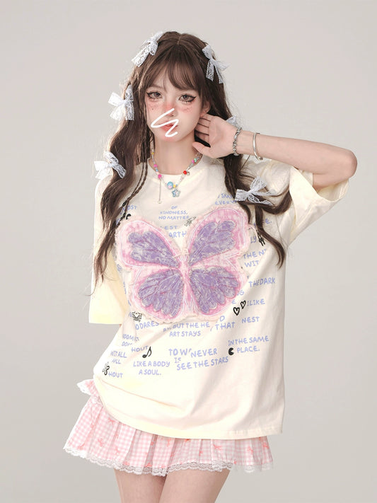 ピュアホワイトピンクバックドロストリボンクロップドTシャツ