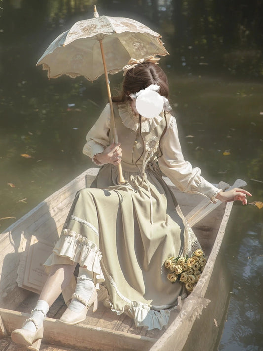 フレンチレトロフリルブラウス+ロンググリーンベストワンピース