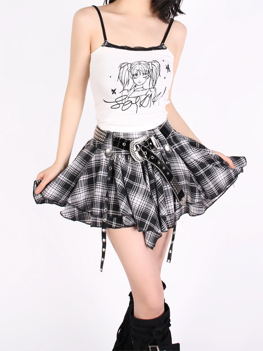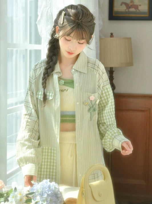 ミントスウィートカジュアルチェックシャツ+ショートニットインナー+スカート
