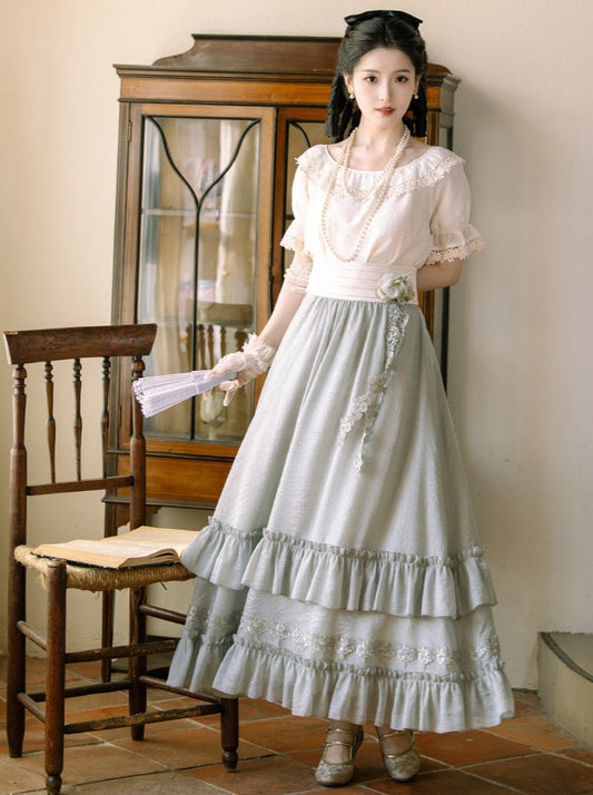 【予約商品】レトロフリルトップス+ロングスカート+パールベルト