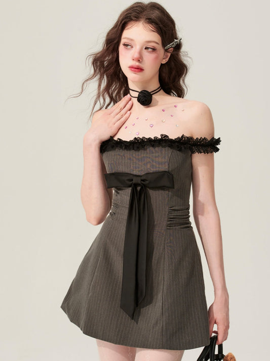 【予約商品】スモークカラーワンショルダーグレーストライプワンピース