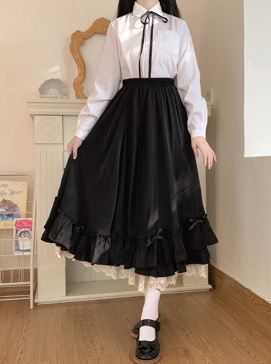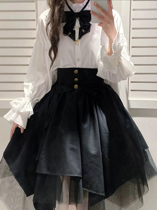 レトロゴシックスタイルリボンタイシャツ+イレギュラーチュールスカートスーツ