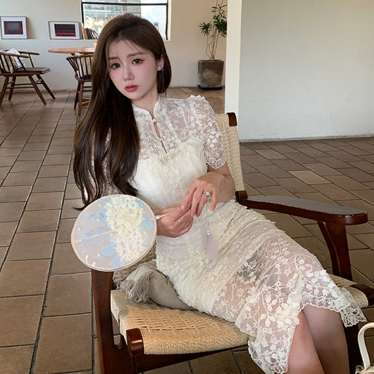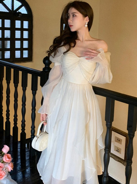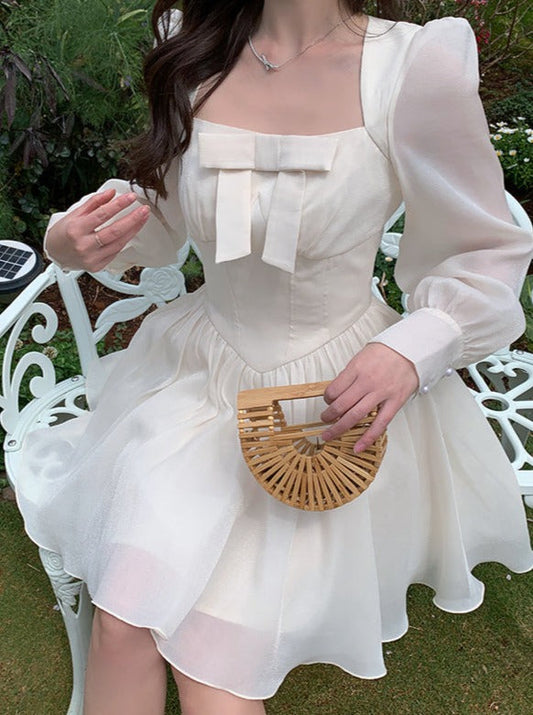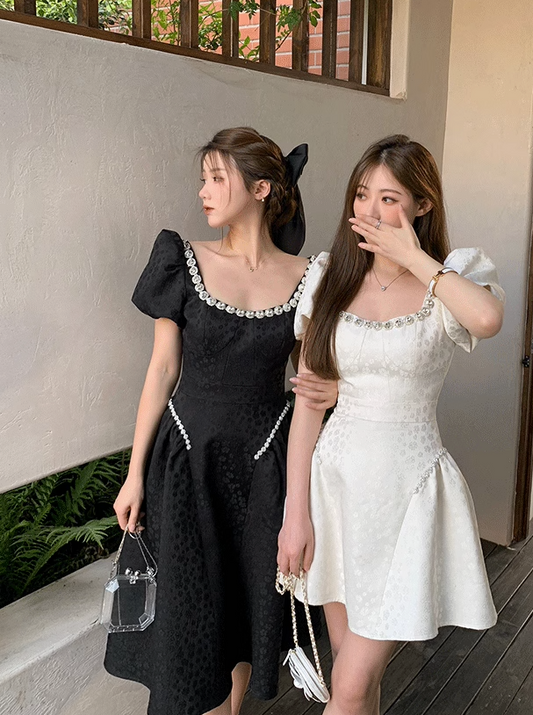 フレンチシンプルネイルダイヤモンドスカートスクエアネックジャカードパフスリーブワンピース