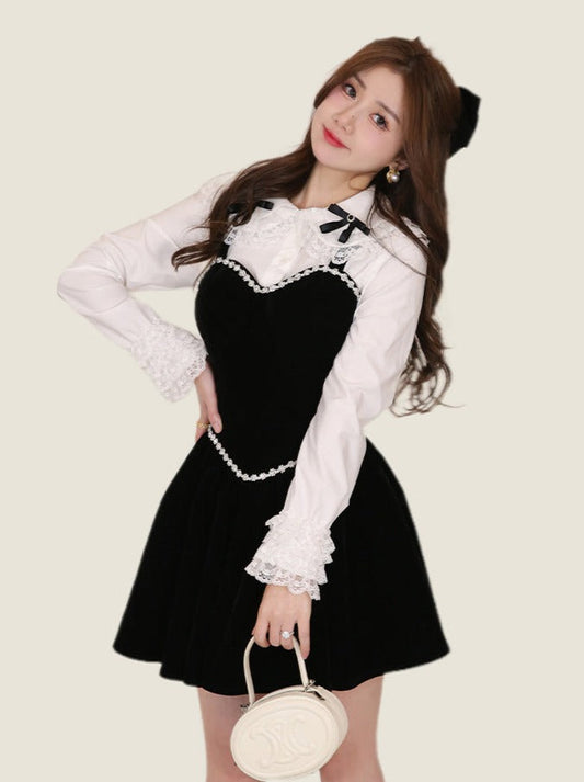 ドットワンショルダートップストラップブラックスカートスイートセットアップ
