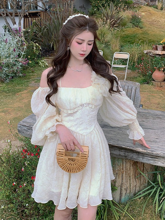 フレンチスクエアランタンシアースリーブフラワーワンピース