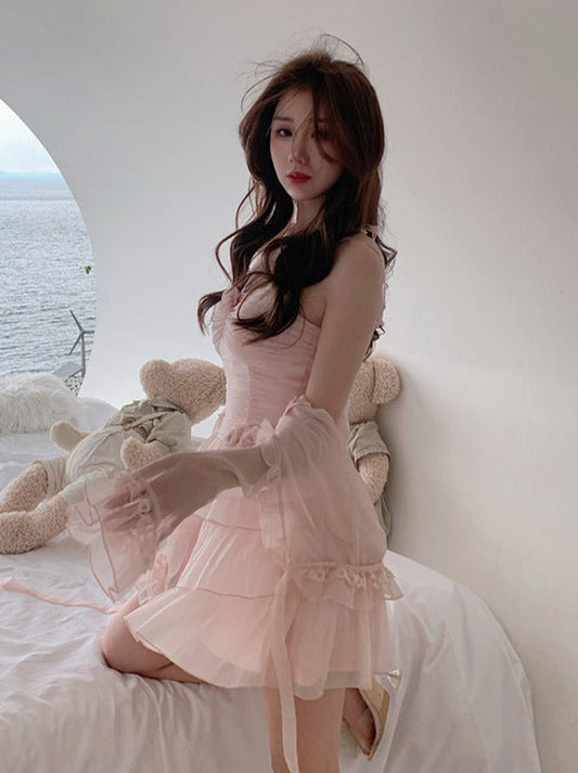 シアーレースカーデ+ピンクローズホルターネックティアードサスドレス
