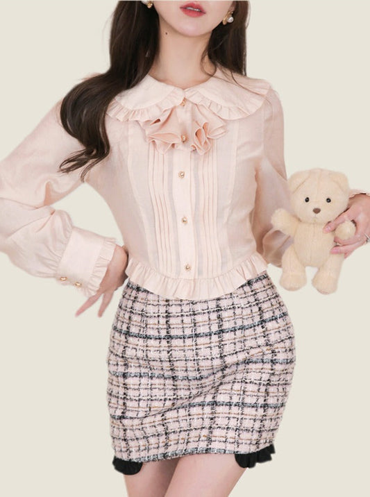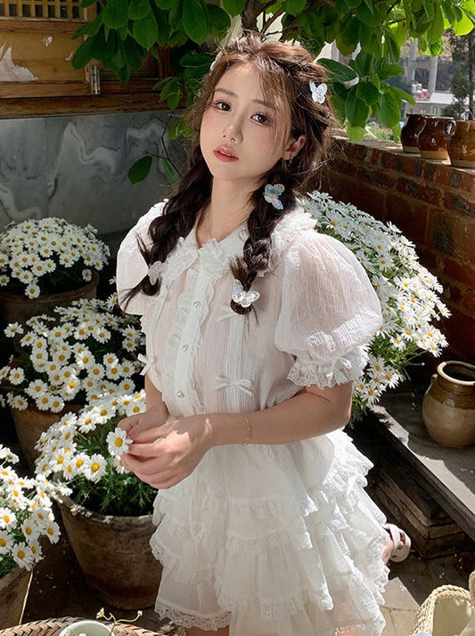 フレンチドールカラーパフスリーブシアーブラウス+ティアードスカート
