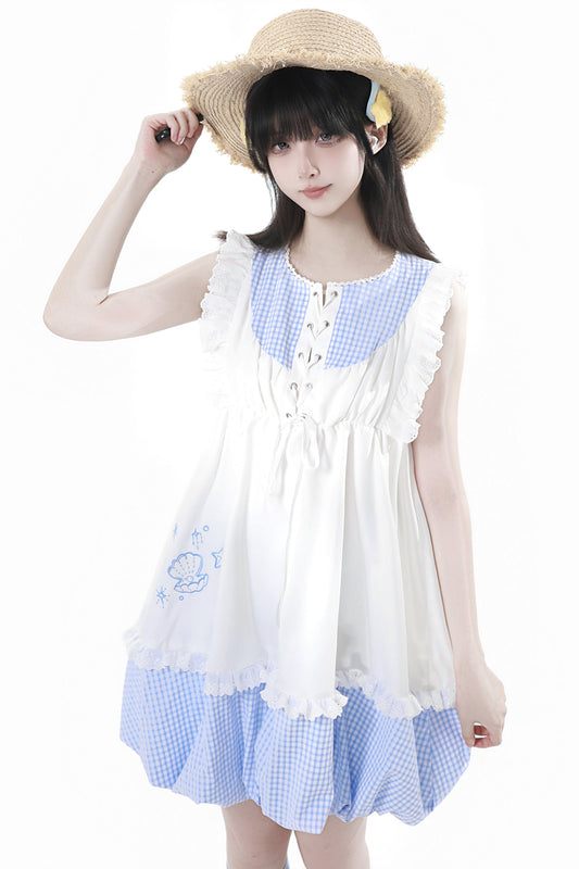 シェルパズルノースリーブトップス+チェックショートパンツ+バルーンドレス