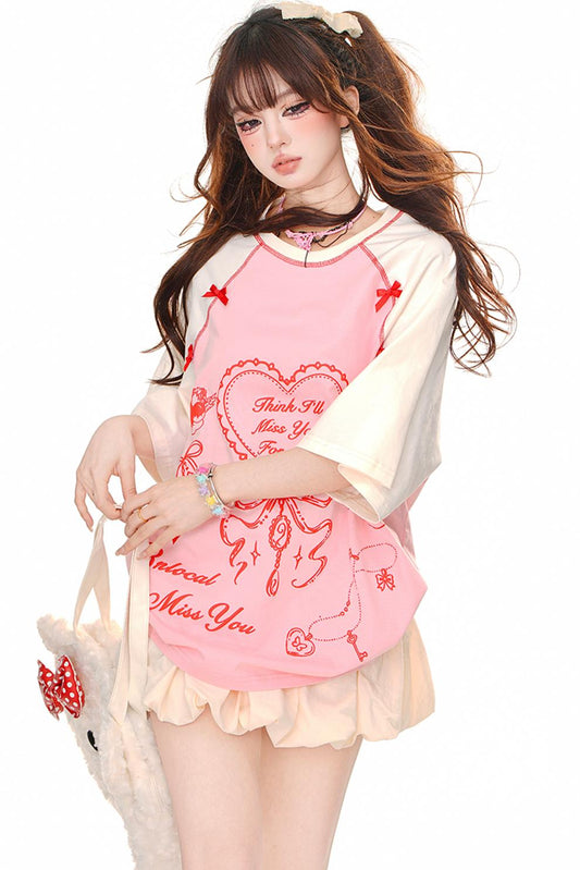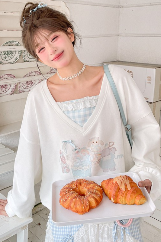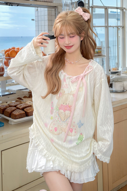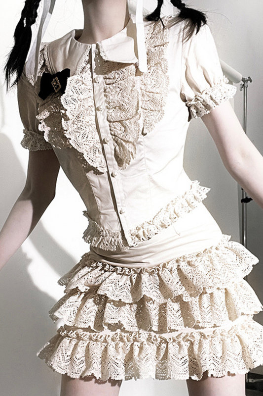 プリンミルクケーキパフスリーブトップス+サスペンダースカート