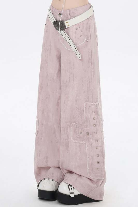 ピンクデニムハイウエストストレートレッグワークパンツ