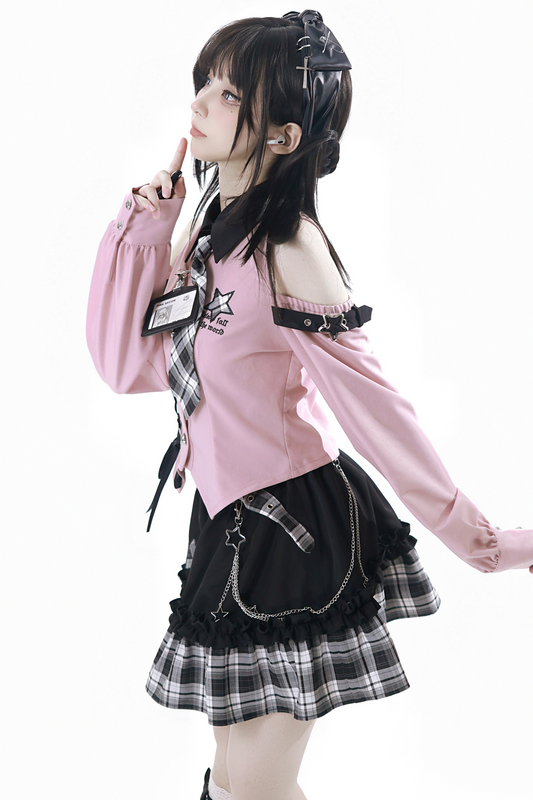 チェックネクタイブラウスウラスキャミソール+スカート+ショートトップス