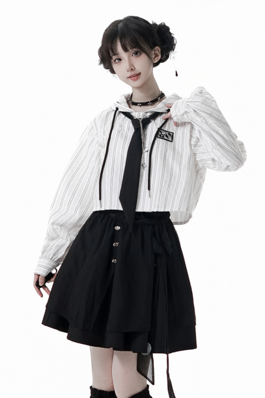 カジュアルストライプステッチデザインシャツ+フードシャツ++ハーフパンツ+キュロット+ネクタイ