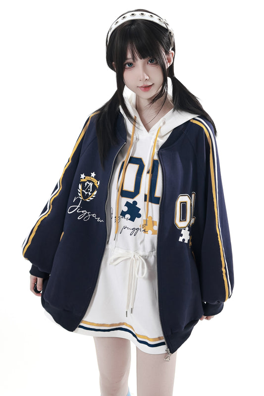 カレッジブルージャケット+フーディードレス+パンツ+スウェット