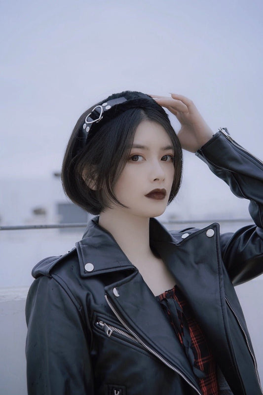 クロスチェーン&クロスジップレザーベルトアシメフェイクファーレッグウォーマー