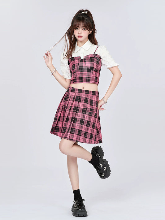 スリムレトロカレッジベスト+シャツ+プリーツスカート