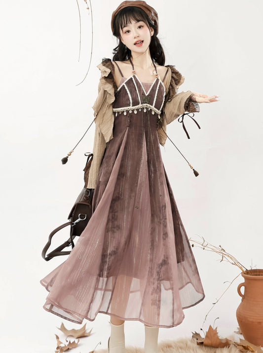 エスニックスタイルキャミソールワンピース+フリルショートカーディガン