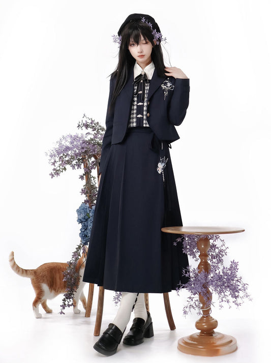 チャイナカレッジジャケット+バックルチェックベスト+ブラウス+プリーツスカート