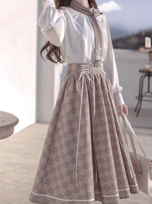 レトロチェックベスト+ブラウス+チェックフレアスカート