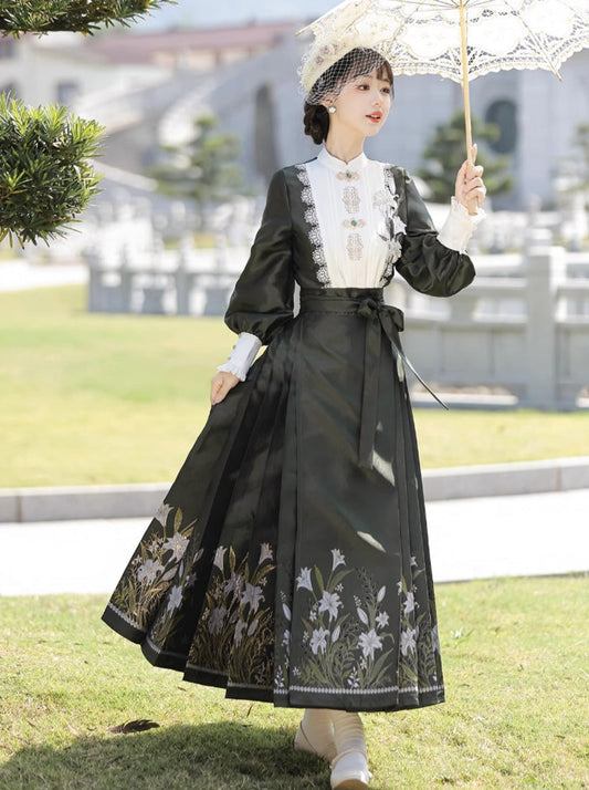 エレガントレトロブラックリボンボリュームスリーブシャツ+フリルショルダーサスペンダースカート
