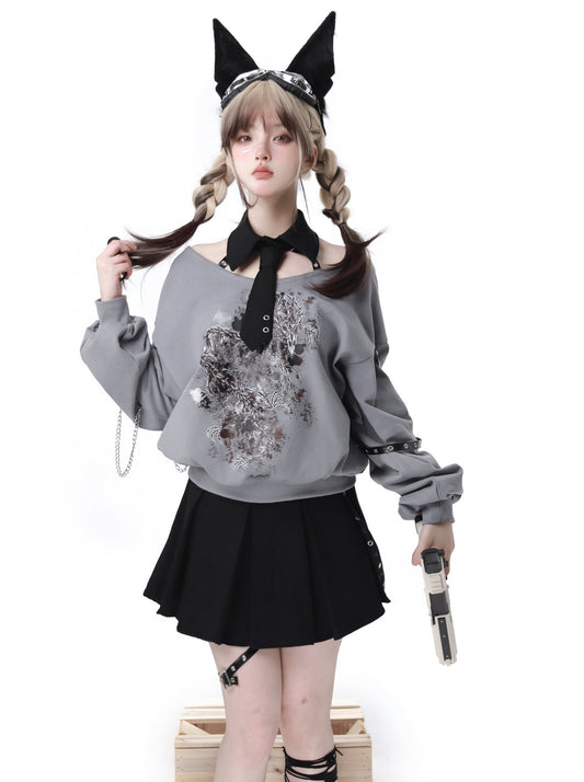 ダークソーンプリントデザインスウェットスーツアイレットトレーナー+レースイレギュラースカート