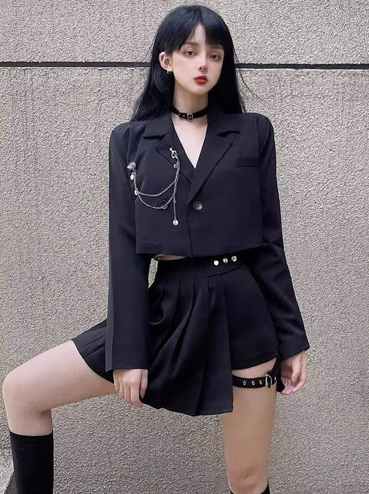チェーンストラップ付きクロップドジャケット+スプリットメタルバックルスカート
