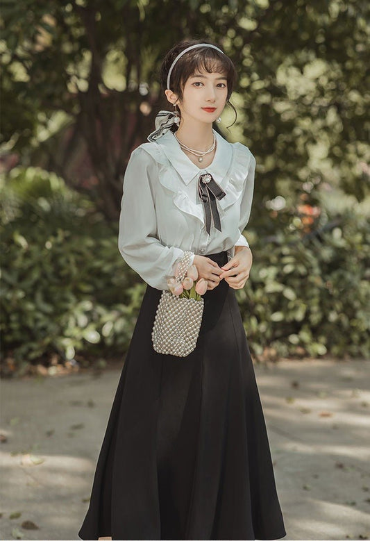 ポインテッドカラーフリルブラウス+レースアップフリルスカート