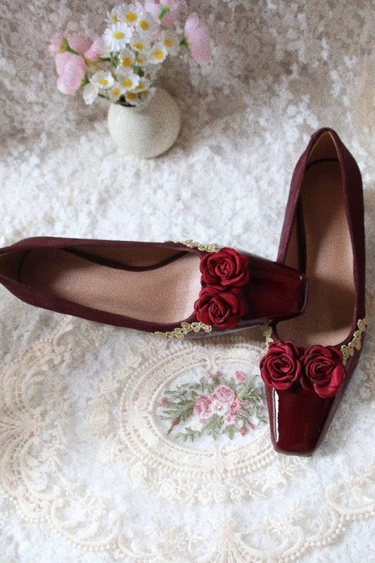 ローズストーリーレトロポインテッドトゥレザーベルベットヒール