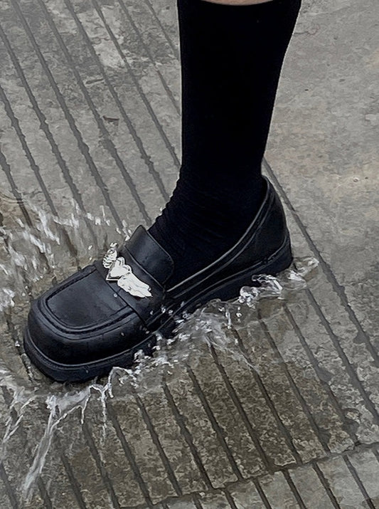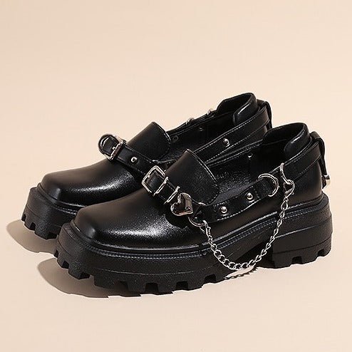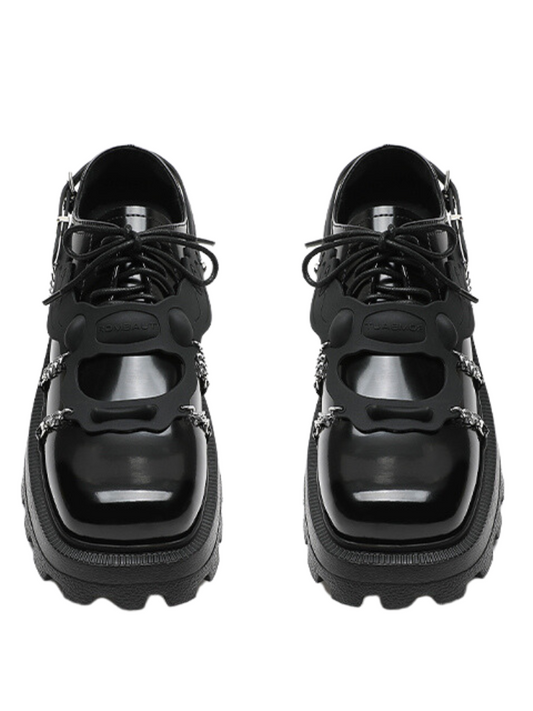 メタルチェーンスクエアトゥレースアップマフィンソールローファーシューズ