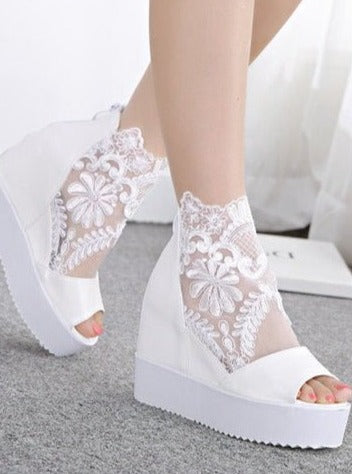 ウェッジソールオープントゥダマスクフラワーレースブーツ