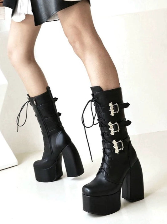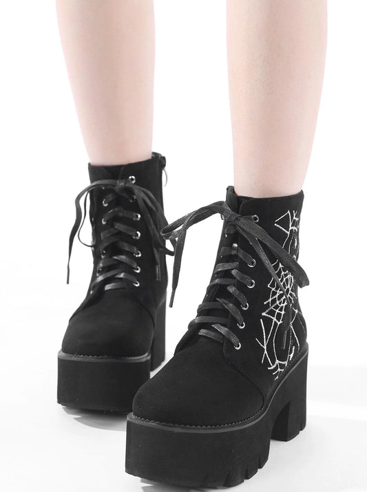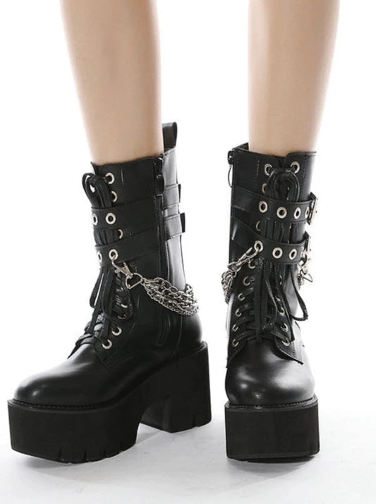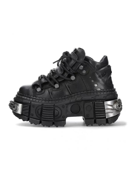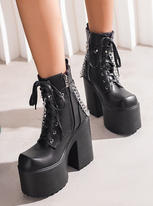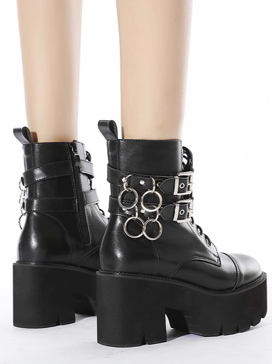 ダークパンクメタルレースアッププラットフォームショートブーツ