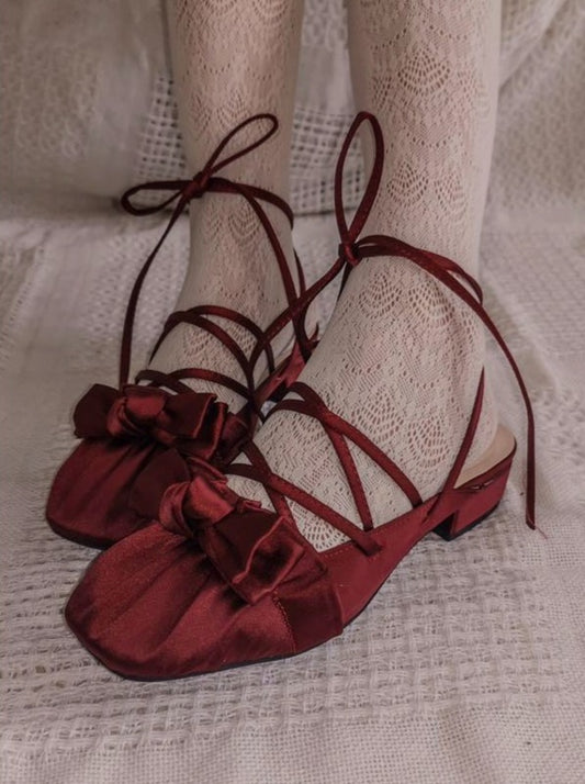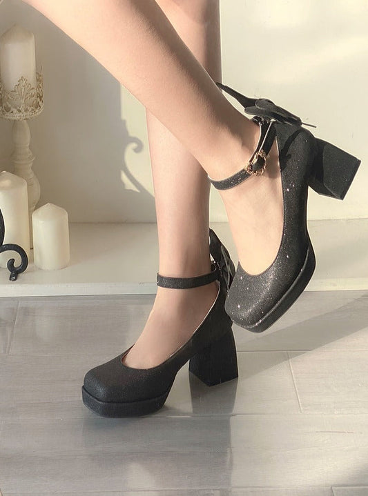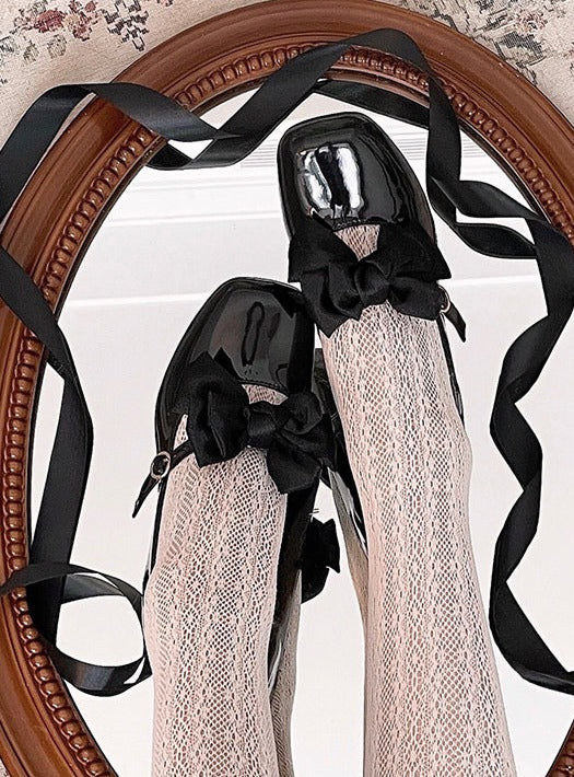 スクエアトゥメリージェーンリボンフレンチエレガントハイヒール