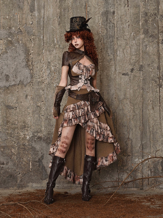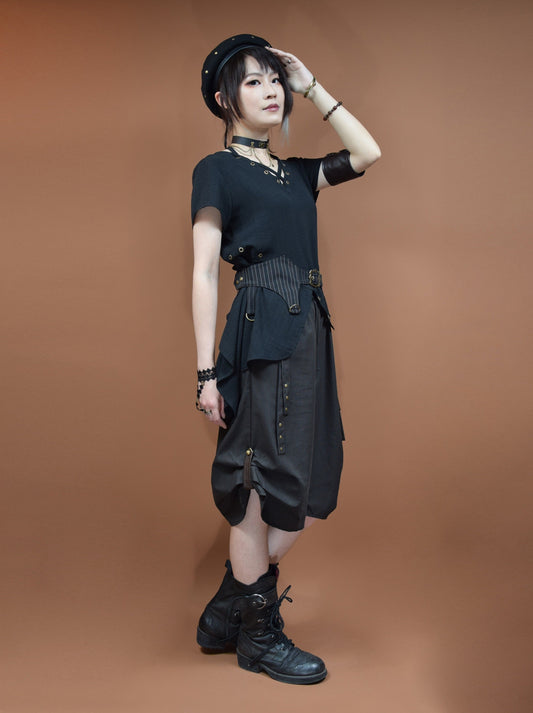 スチームパンクアシンメトリーPUメイラードチェストサポートストラップスカート