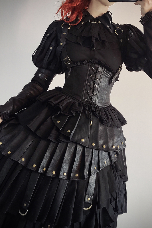 【予約商品】ブラックミストゴシックスチームパンクゴージャスマットレザーシャツ+コルセットサスペンダードレス