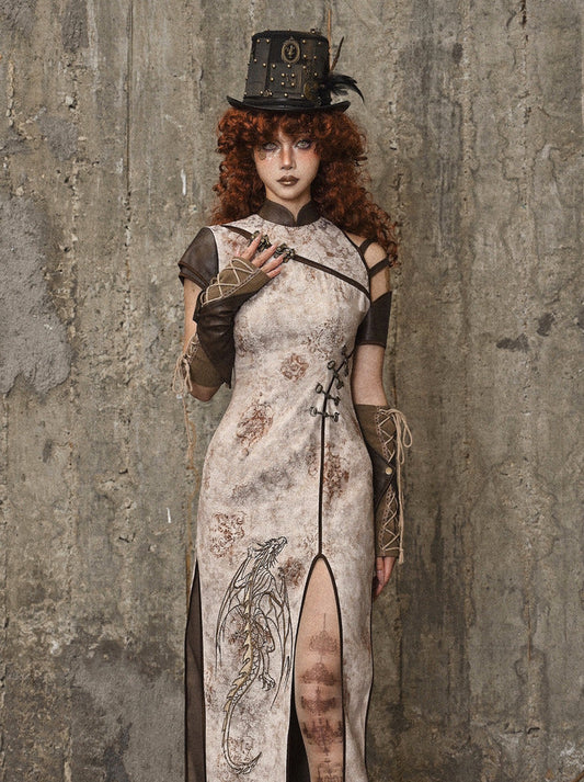 レトロパンクストラップドラゴンエンブロイダリーチャイナスリットドレス