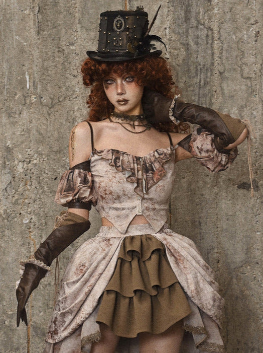 レトロスチームパンクハートフリルカラータイダイベストトップス