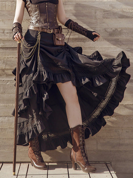 スチームパンクブラックドロストティアードレトロエッジロングスカート