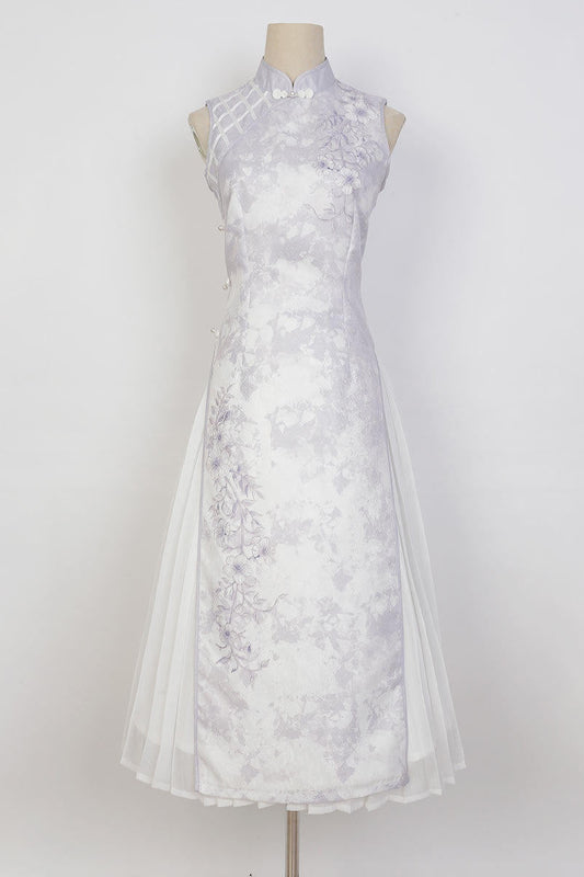 ライトパープルフラワーチャイナドレス+フリルシアーカーディガン