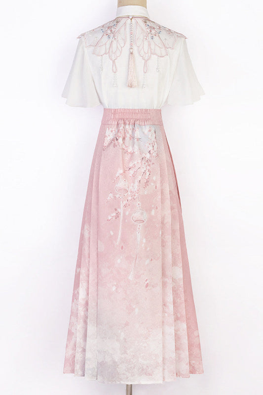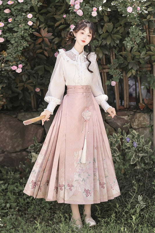 チャイナレースフリルブラウス+プリーツスリットロングスカート