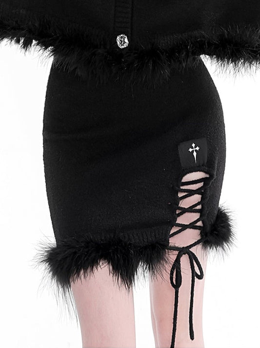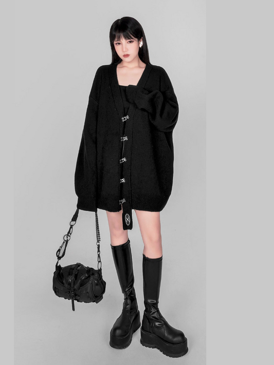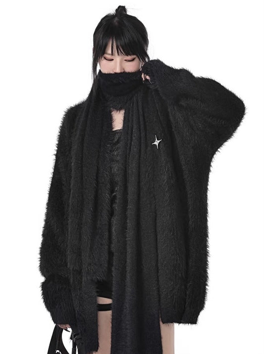 メタルスターダークスタイルルーズファーニットマフラー付きカーディガン