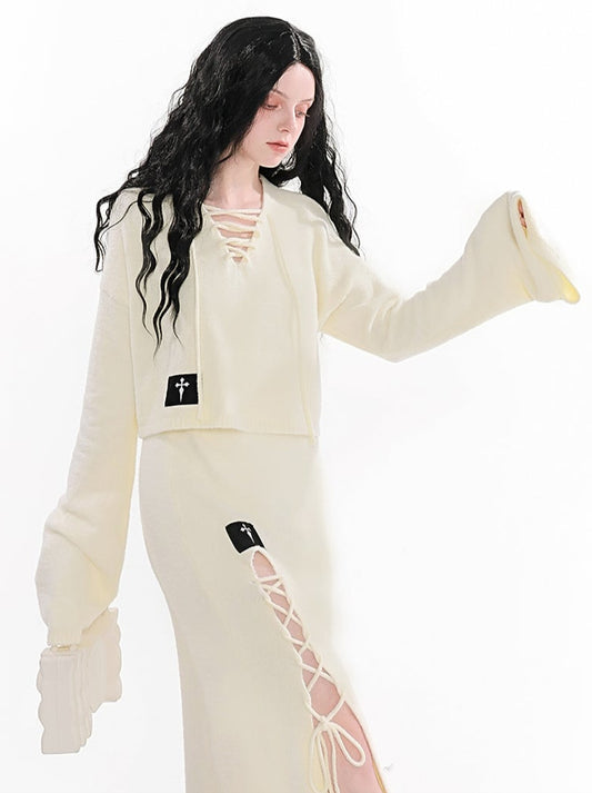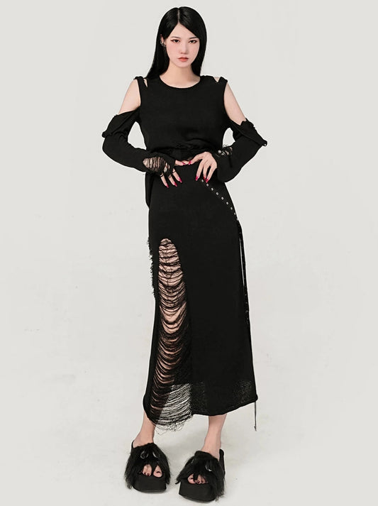ブロークンオフショルダーニットセーター+ニットロングスカートセットアップ