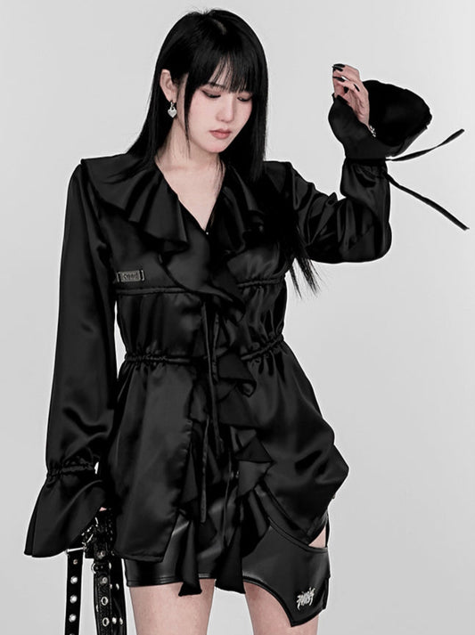 ラッフルエッジレーフレアスリーブドローストリングシルクシャツ