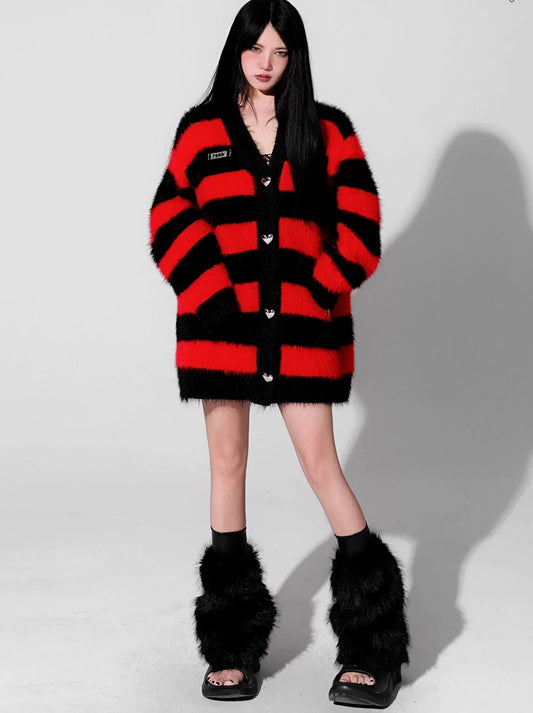 小悪魔カラーレッドブラックフェイクファーストライプパンクニットカーディガン